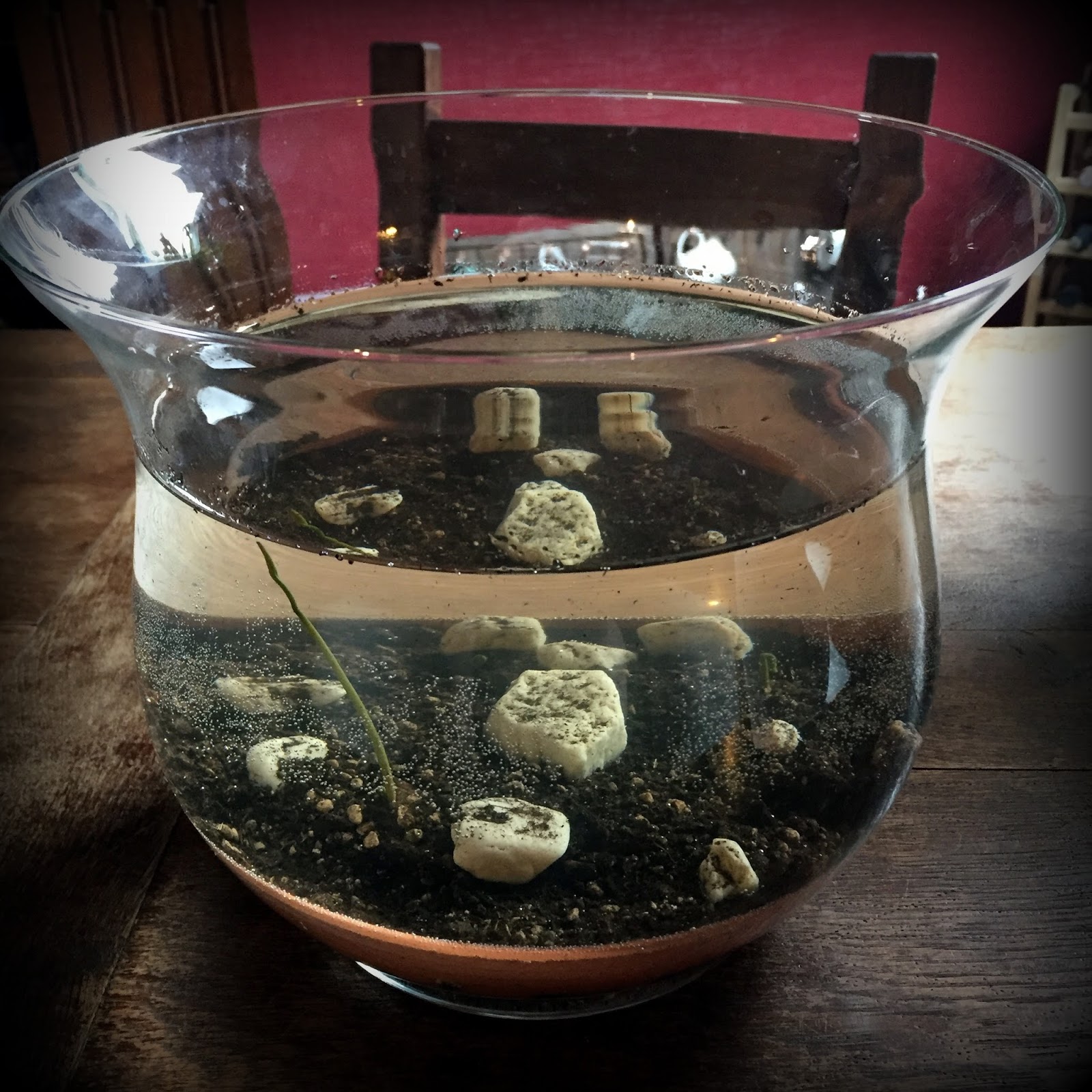 Drei Samen sind aufgegangen und sitzen nun in meinem Lotuspflanzen“teich“. Einer guckt mittlerweile schon mit seinem Blatt oben aus dem Wasser heraus… :o)