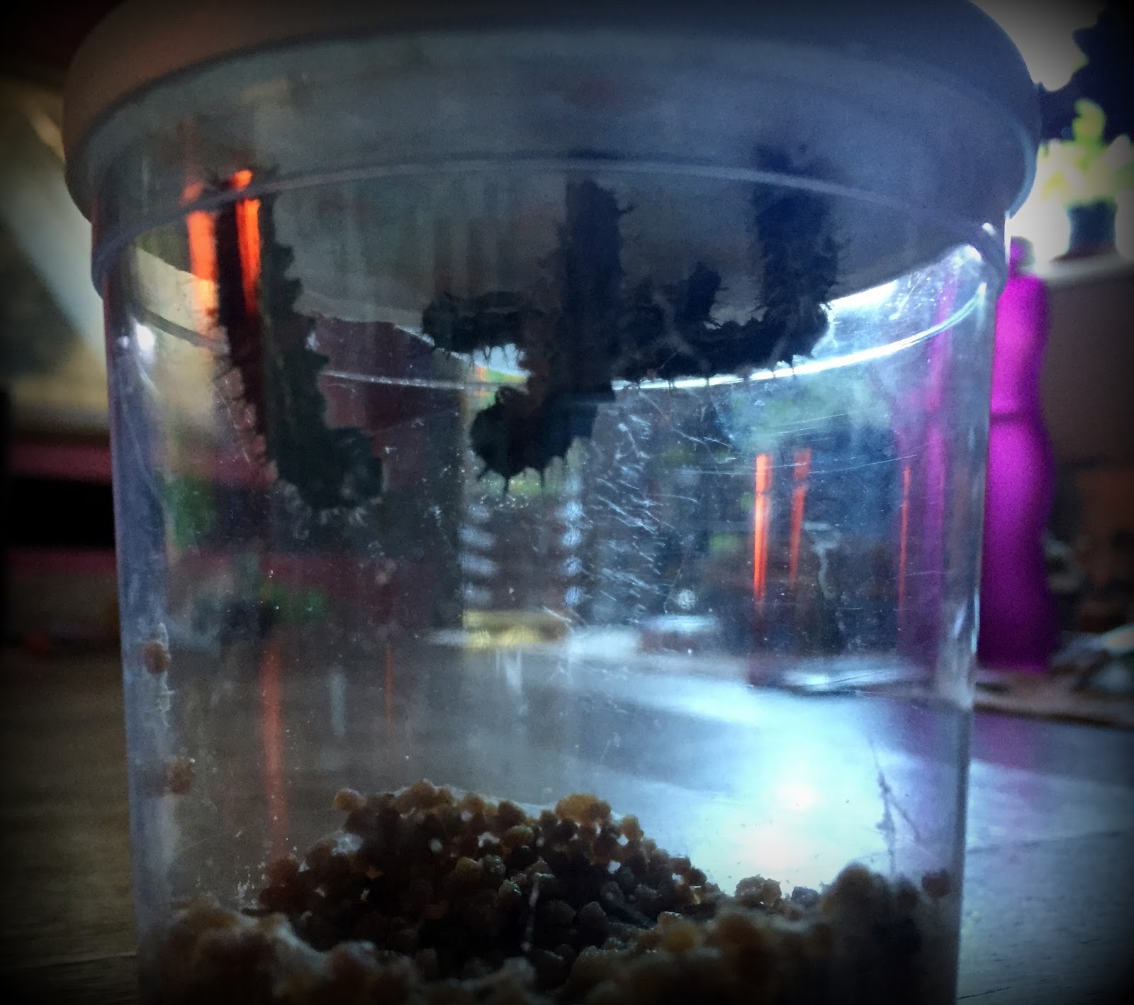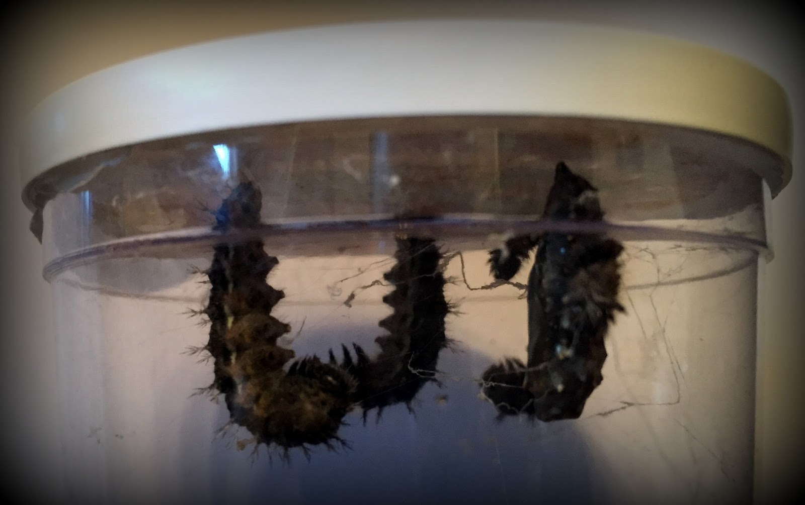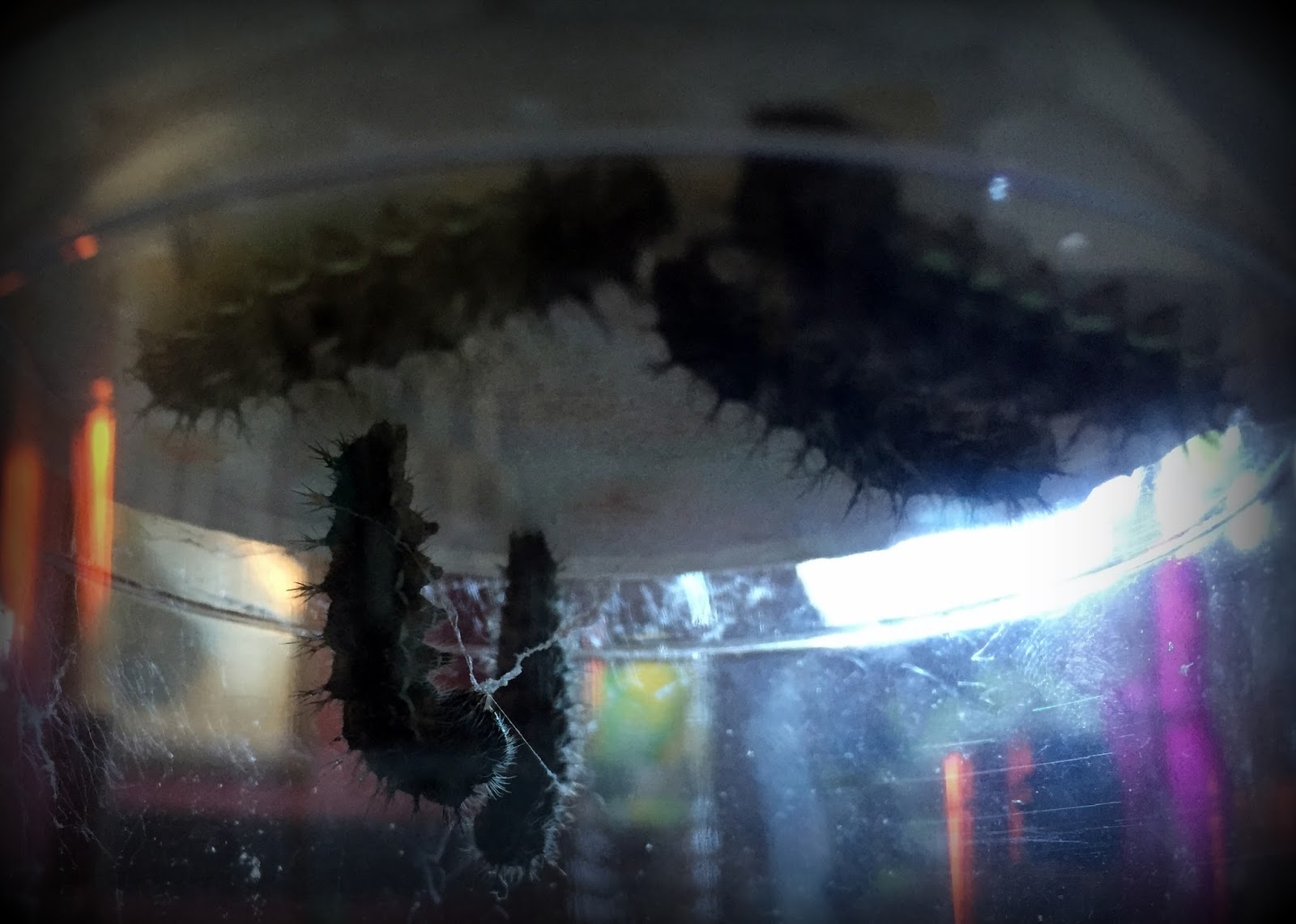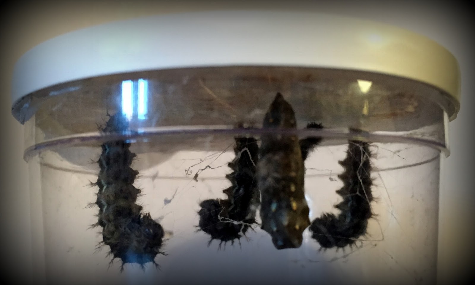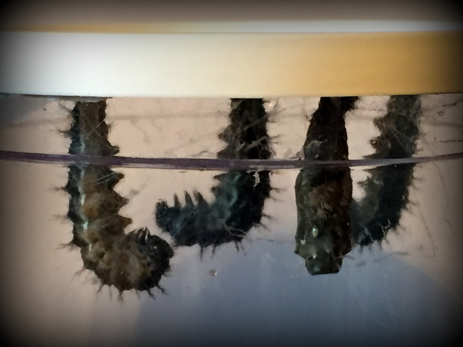 Heute morgen war ich sehr überrascht, denn ich hatte nicht damit gerechnet, dass die Räupchen sich bereits an der Decke des Gefäßes aufhängen würden. Als ich das erste Mal schaute hingen bereits zwei dort oben.