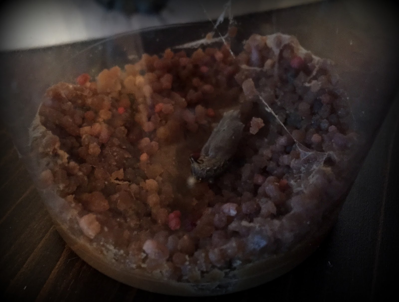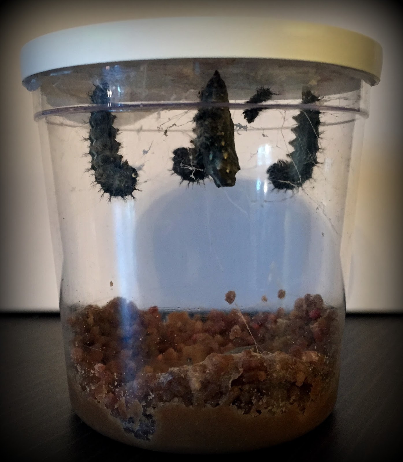 Und dann, eben, als ich von draußen vom Abendbrot reinkam hingen vier der fünf Raupen am Deckel. Zwei hatten sich bereits verpuppt und eine Puppe war leider heruntergefallen. Man soll sie ganz vorsichtig nehmen und auf ein Papiertuch in das Aerarium legen, dann hat die Puppe noch eine gute Chance sich zum Schmetterling zu entwickeln.