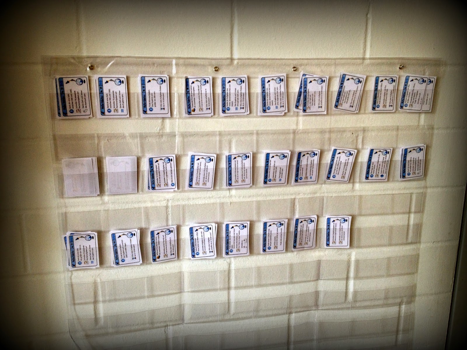 Letztens habe ich meine Einsteck-Hundertertafel umfunktioniert. Normalerweise haben wir dort drin Kärtchen von 1 bis 100 stecken gehabt und an ihr den Hunderterraum erschlossen. Das ist ja nun laaaaaaage vorbei und um die Tafel in den Schrank zu legen, bis sie wieder gebraucht wird, war sie mir zu schade.