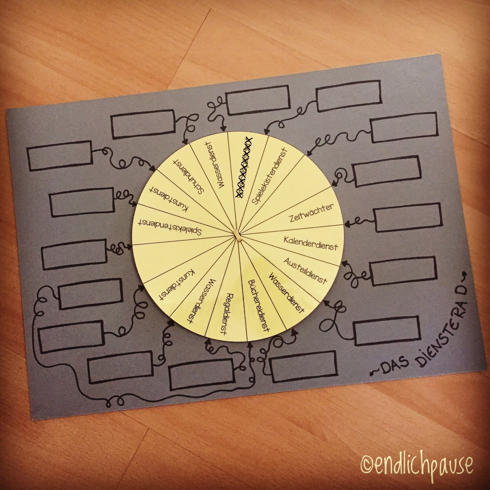 Außerdem habe ich vor meine Diensteliste durch ein Diensterad zu ersetzen. Ich drehe es dann einfach jeweils ein Feld weiter und hoffe, dass es dann schneller geht als sonst… Außen in die Felder schreibe ich die Namen der Kinder. Die Idee habe ich bei Instagram gesehen.