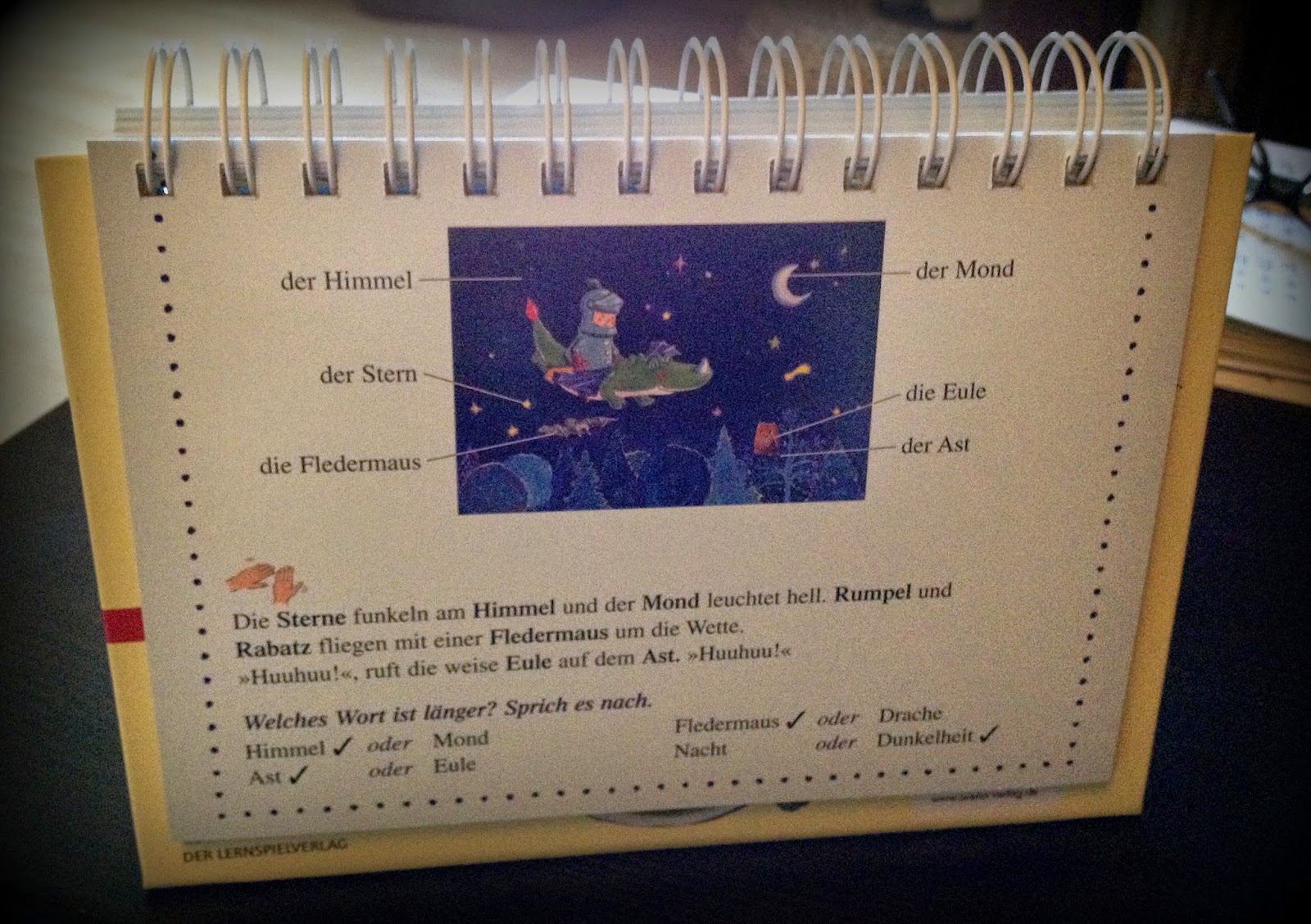 Der „Lesekalender“ – so will ich ihn mal nennen – eignet sich toll für die Sprachförderung, vor allem auch im DaZ-Bereich, finde ich. Auf der einen Seite (dort wo das Kind sitzt) findet man immer ein Bild und auf der anderen Seite stehen ein Vorlesetext und verschiedenen Aufgaben.