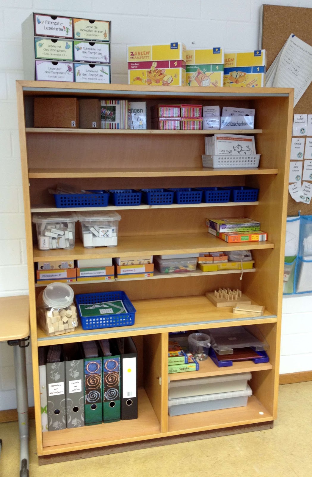Im Laufe der nächsten Woche werde ich mir mal ein Stündchen Zeit nehmen, um den Schrank fertig einzuräumen. Künftig ist er unterteilt in Lesen, Schreiben, Mathe… So finden die Kinder künftig viel leichter das passende Material. Unten links stehen schon einmal ein paar Ordner mit Logicals. In diesem Bereich werden künftig alle Ordner mit Blättern für die Freiarbeit stehen. Alles schön zusammen in einem Schrank – das gefällt mir.