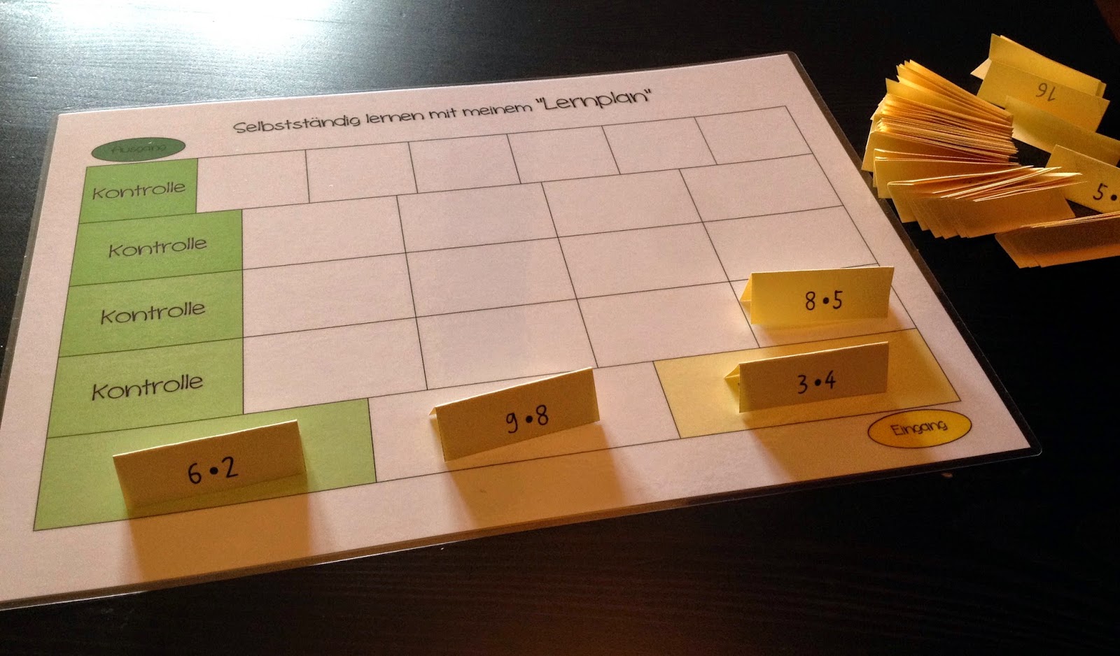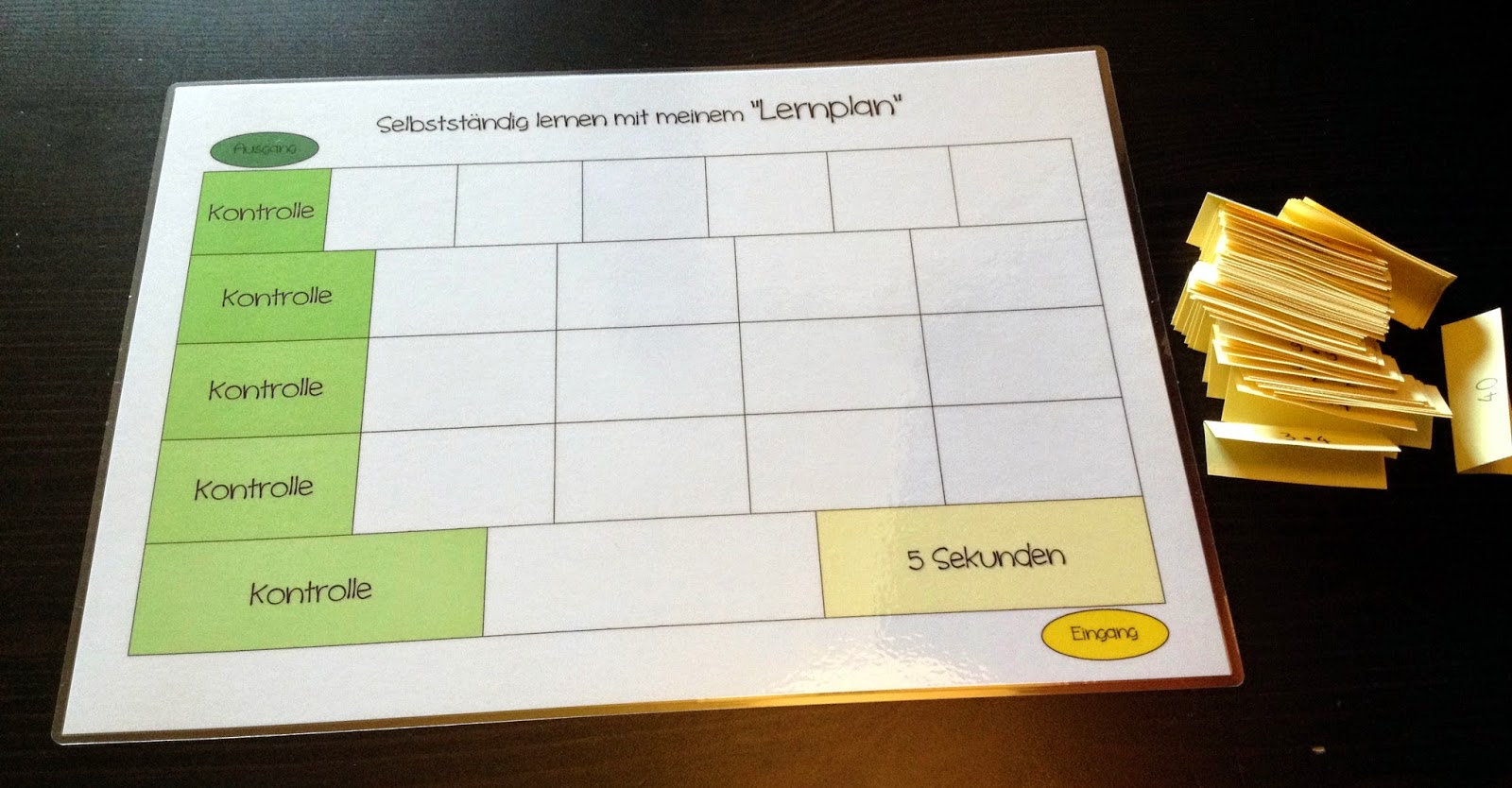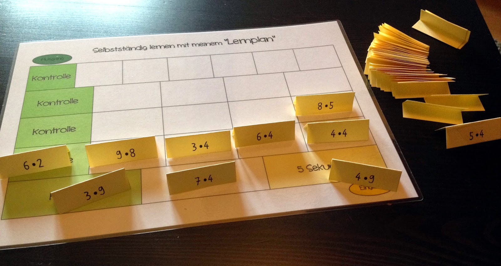 hatte ich schon einmal die Patience-Methode als Möglichkeit des Lernens vorgestellt. Heute ist sie mir wieder in den Sinn gekommen und zwar zum Thema 1×1. Ich habe nochmal etwas vorbereitet, um das Lernen mit dem Lernplan zu erklären. Zum Herstellen der hierfür benötigten Kärtchen findet ihr unten auch die passende Datei. Für einen A4-Plan müsst ihr zwei Seiten auf eine drucken, sonst sind die Kärtchen zu groß.