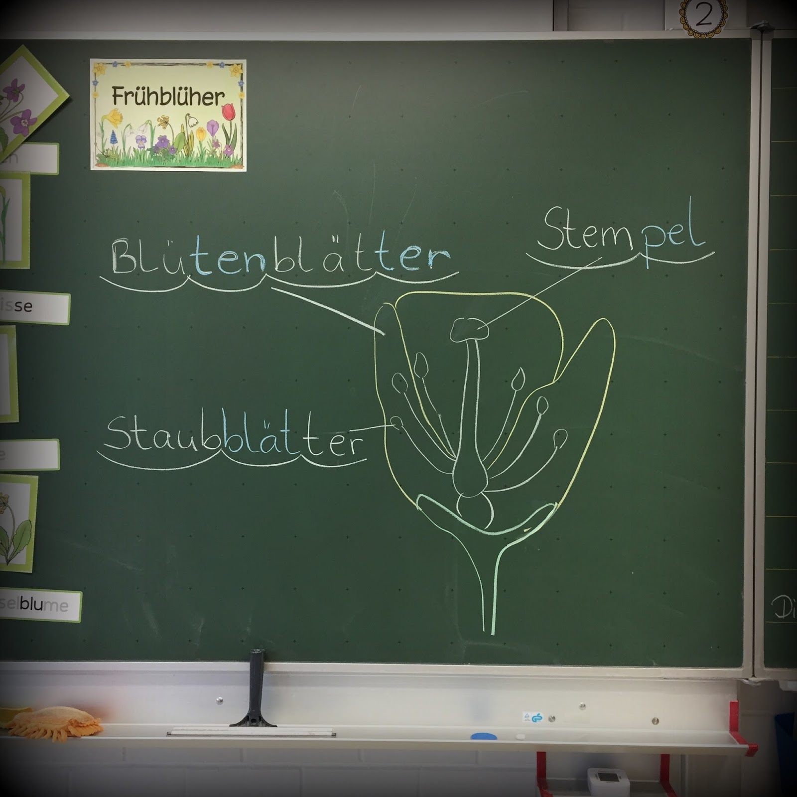 Zunächst ging es mal weiter mit den Frühblühern. Wir haben uns fast verblühte Tulpen mal ganz genau angeschaut. Und in der nächsten Stunde ging es darum, wie die Tulpe wächst…