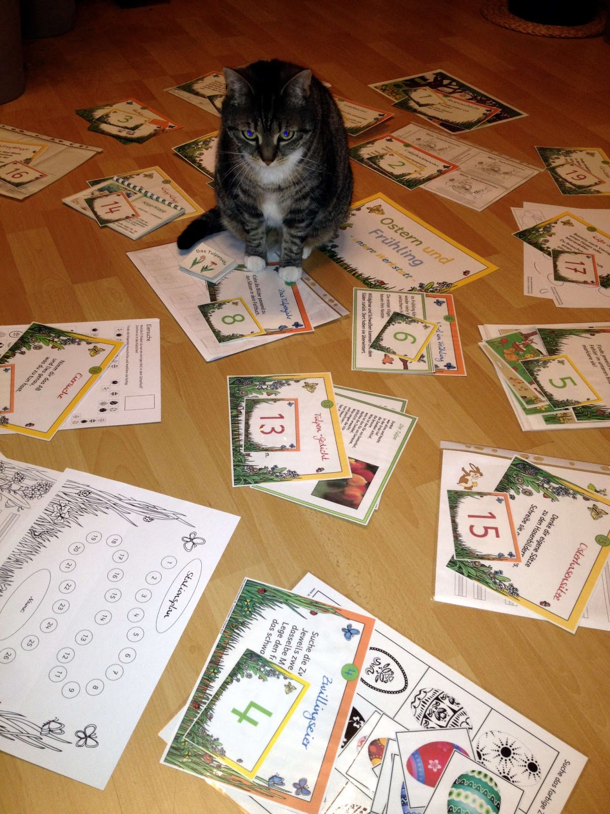 Zunächst muss ich mich mal bei meine Katze für die tatkräftige Unterstützung bei der Vorbereitung der Oster- und Frühlingswerkstatt (teilweise Zaubereinmaleins) bedanken ;o)