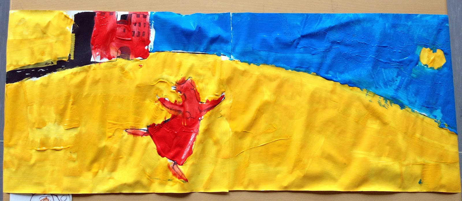 Zu diesem Bild gibt es eine SELBSTMALVORLAGE im Buch. Die haben ich mit den Kindern auf Din A3 hochkopiert und die beiden Seiten dann aneinander geklebt. Ein anderes Format macht auch mal Spaß! Die Ergebnisse waren, neben bemalten Kindern und Tischen, folgende: