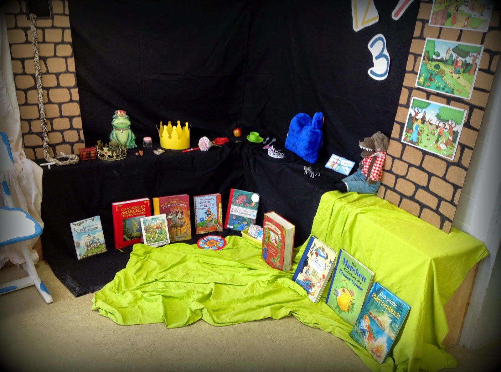 Nachdem die Kinder gestern relativ „unkommentierend“ vor der Märchenecke standen und ich etwas enttäuscht war, sind sie heute „voll abgegangen“. Hausaufgabe war es nämlich, Märchengegenstände und eigene Märchenbücher mitzubringen.