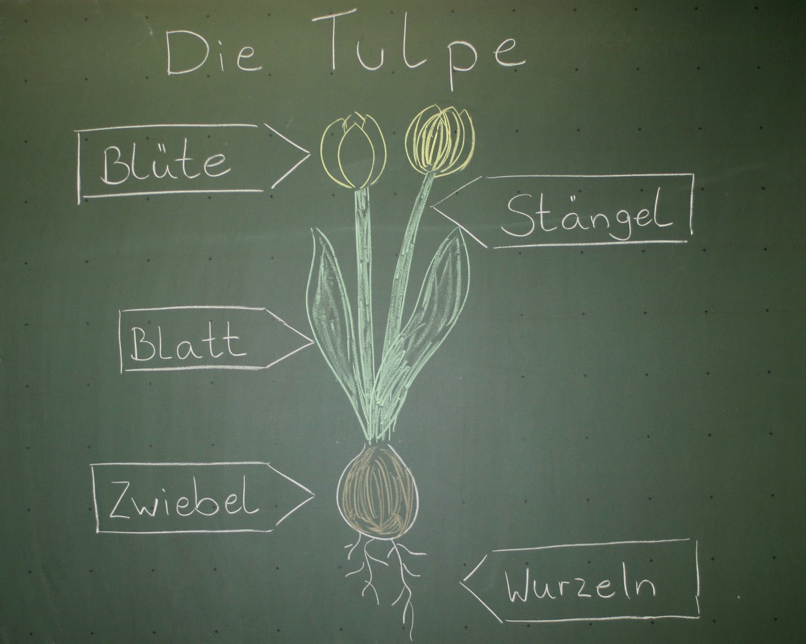 Der Plan war anders, aber da man ja flexibel sein muss, wurde eine große Tulpe an die Tafel gemalt und direkt beschriftet. Wozu lange „rummachen“, wenn das Wissen schon vorhanden ist?